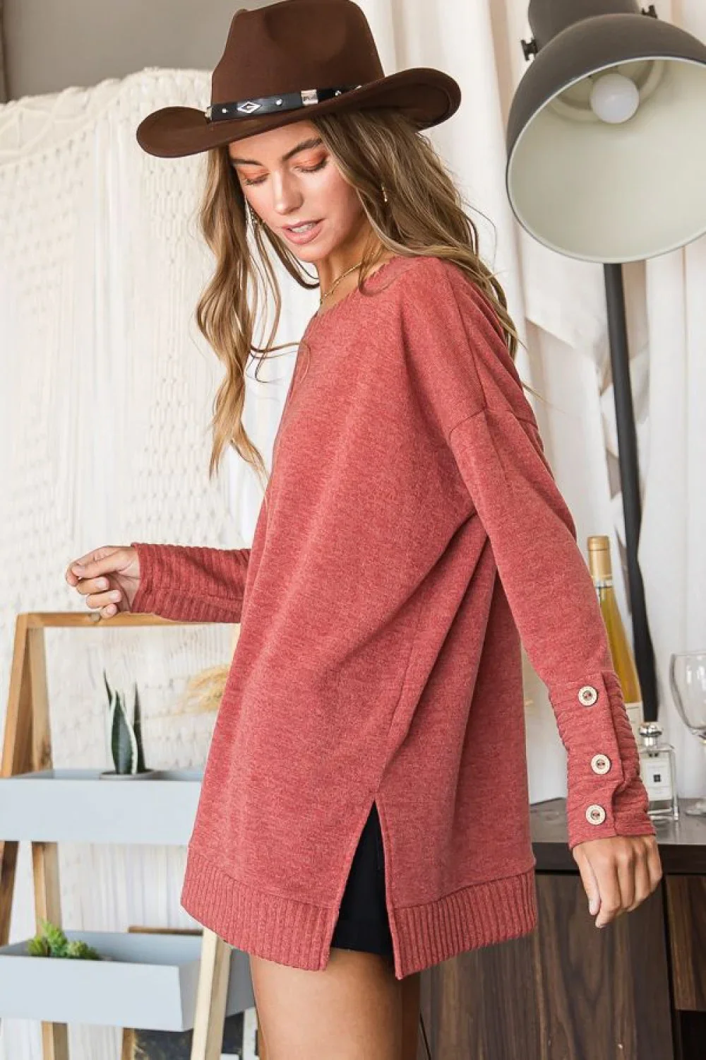 Plus Size Oversized Button Cuff Long Sleeve Tunic Sweater Top