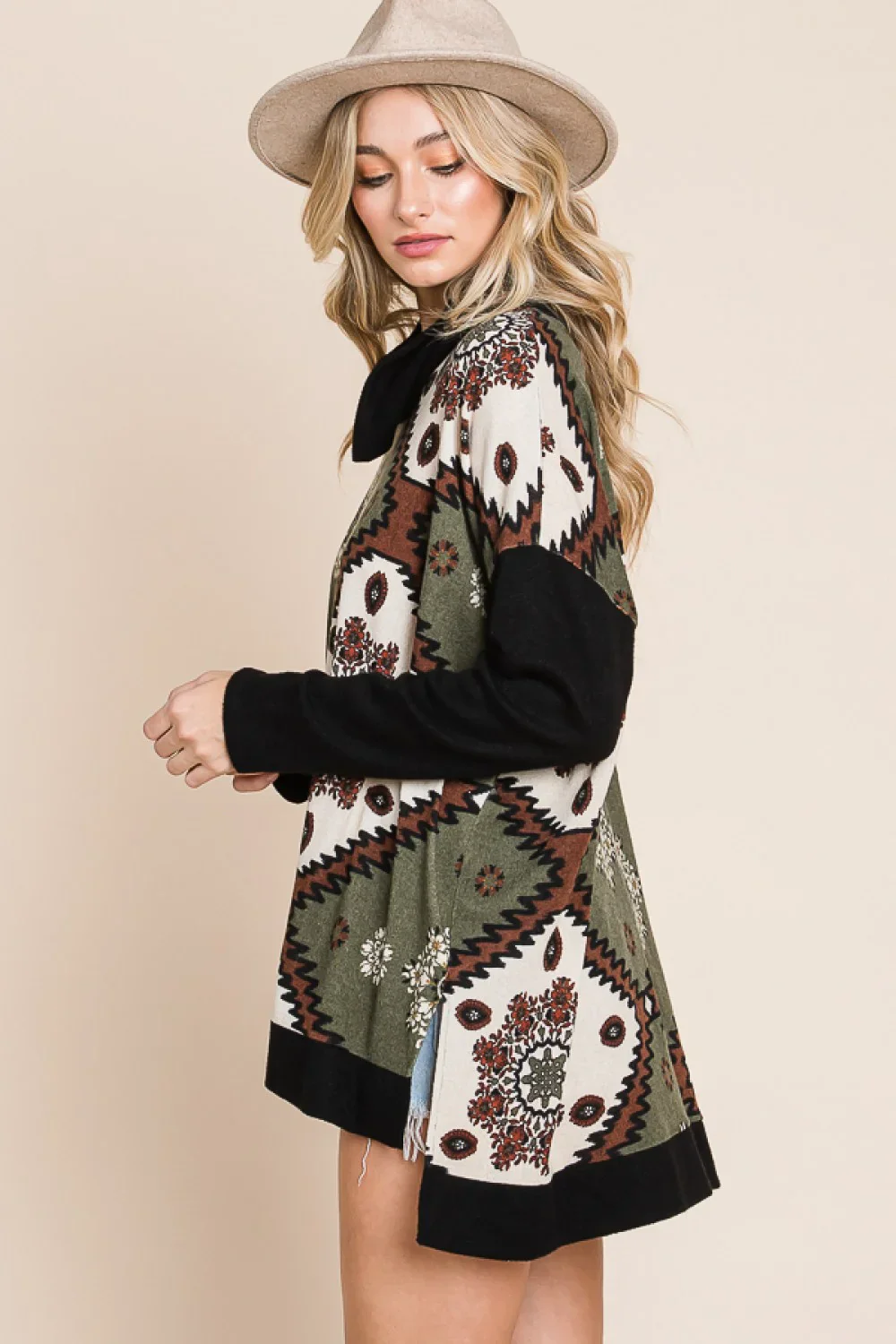 Plus Size Aztec Print Color Block Mock Neck High Low Hem Boho Sweater Top
