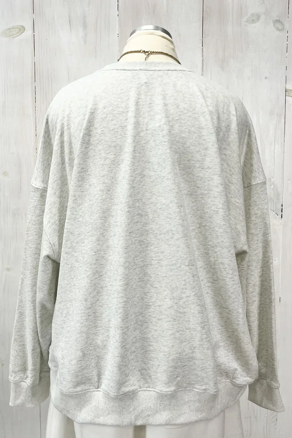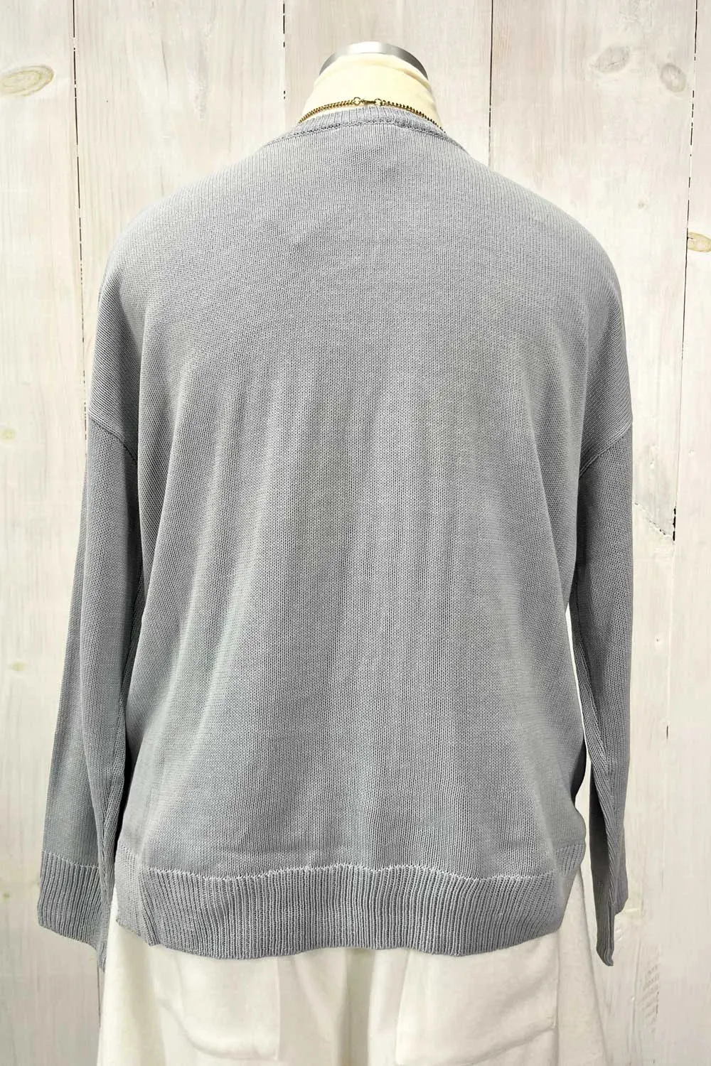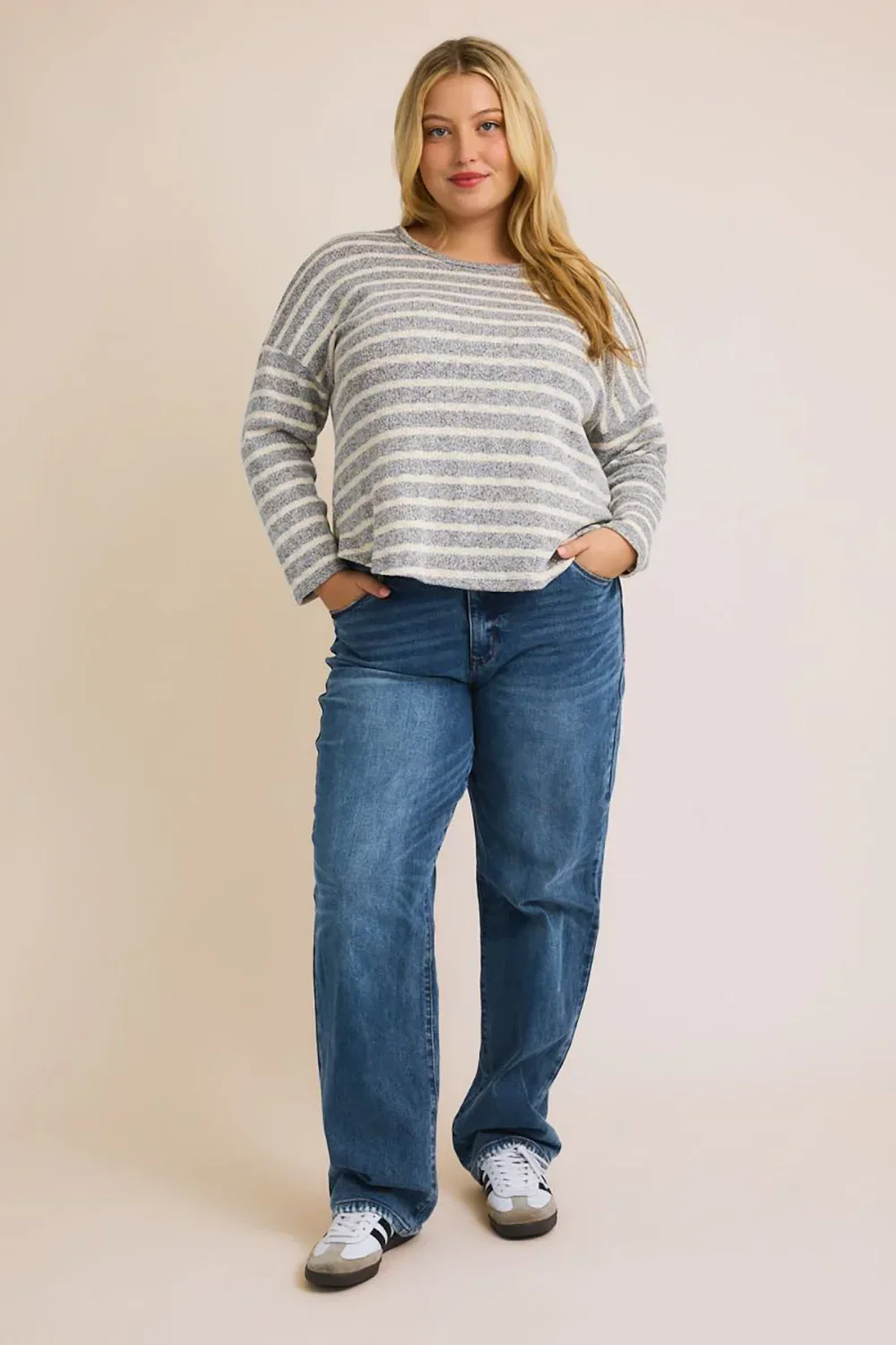 Plus Size Grey Cream Striped Long Sleeve Scalloped Hem Relaxed Fit Knit Top