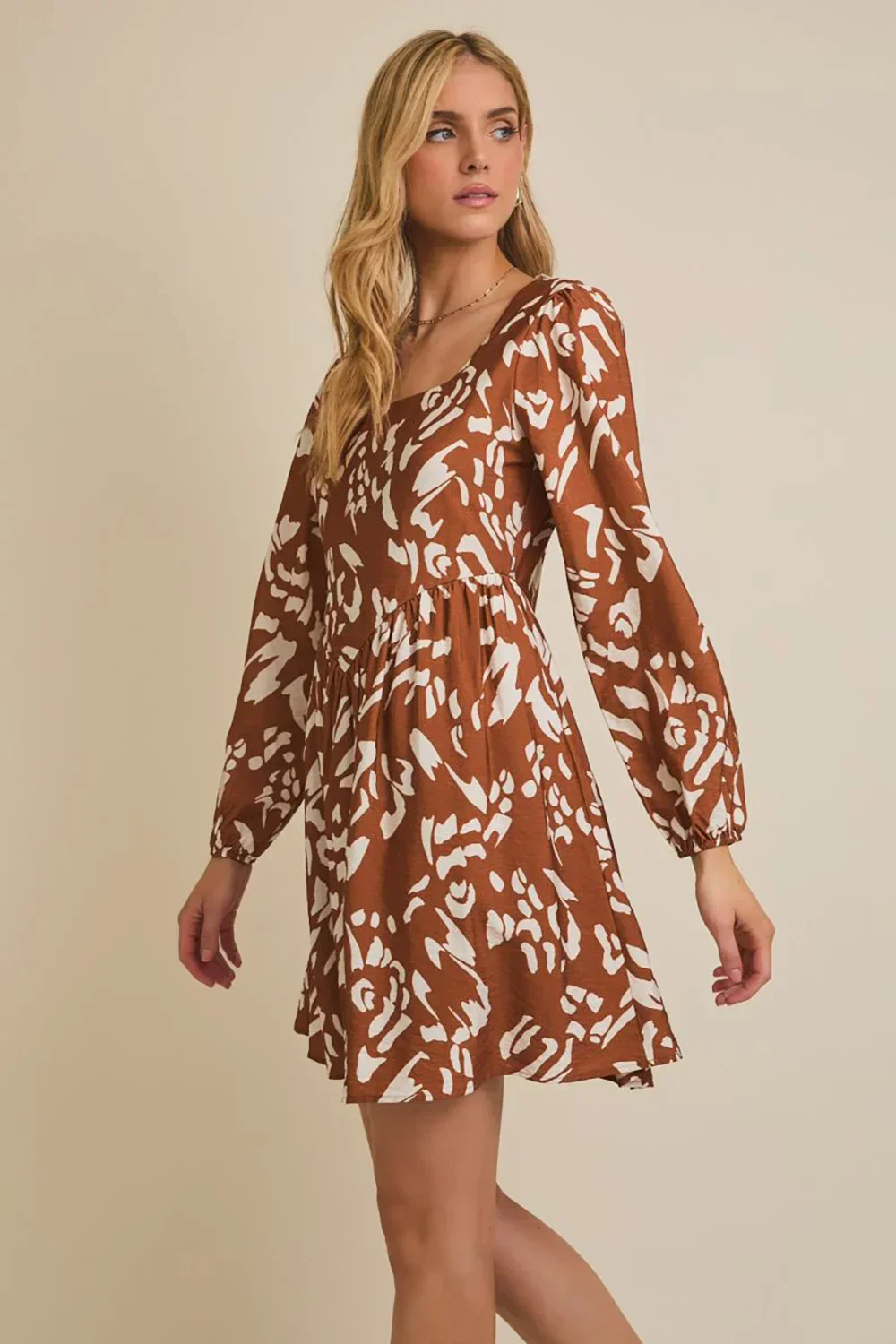 Plus Size Rust Brown Abstract Print Long Sleeve Empire Waist Boho Mini Dress