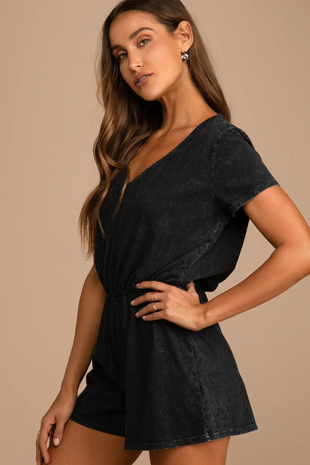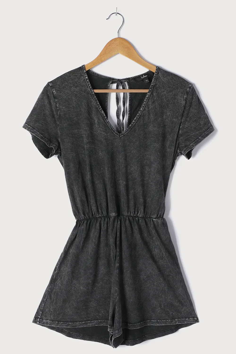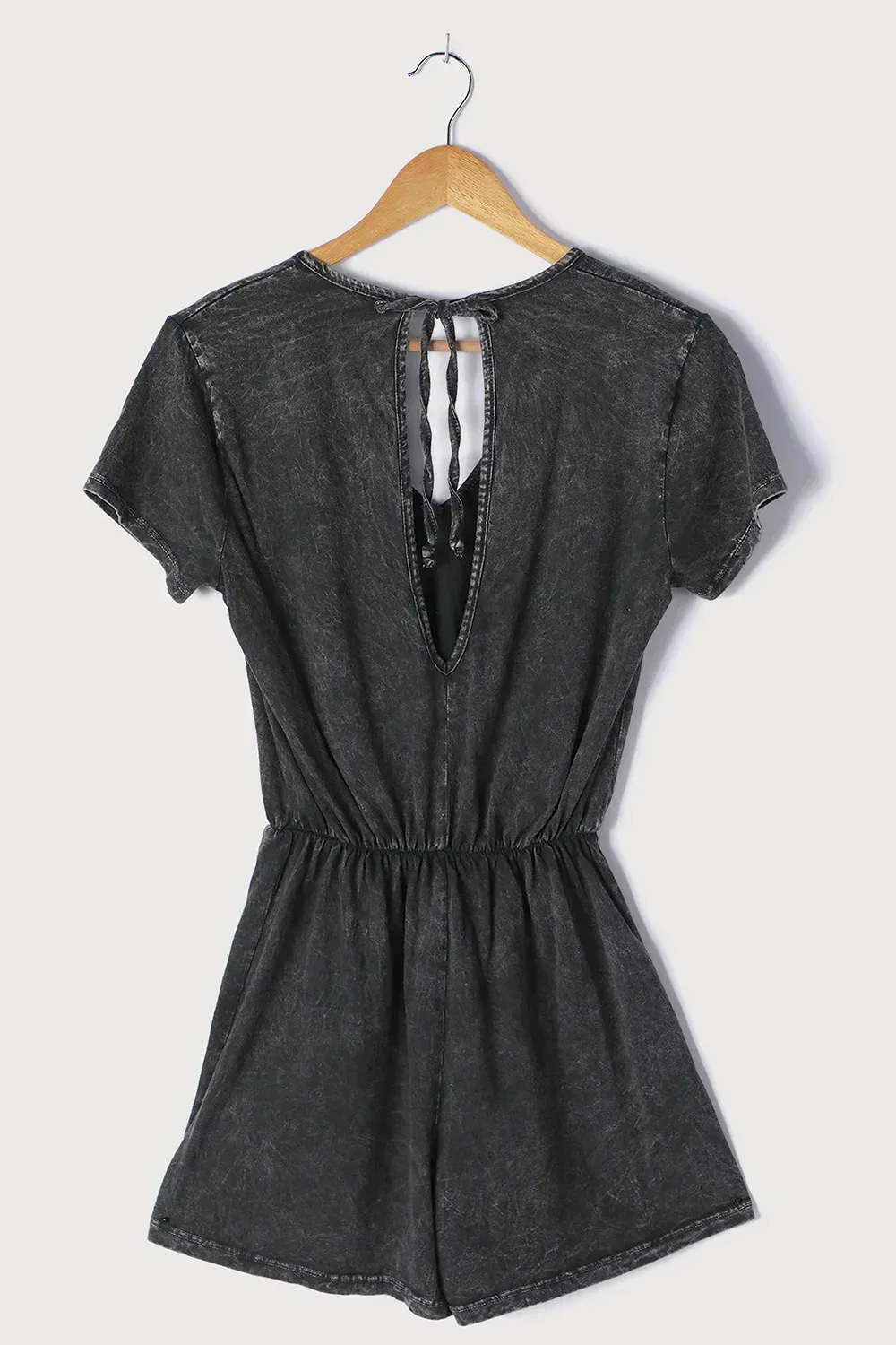 Black Acid Wash Open Back Tie Detail Short Sleeve Romper