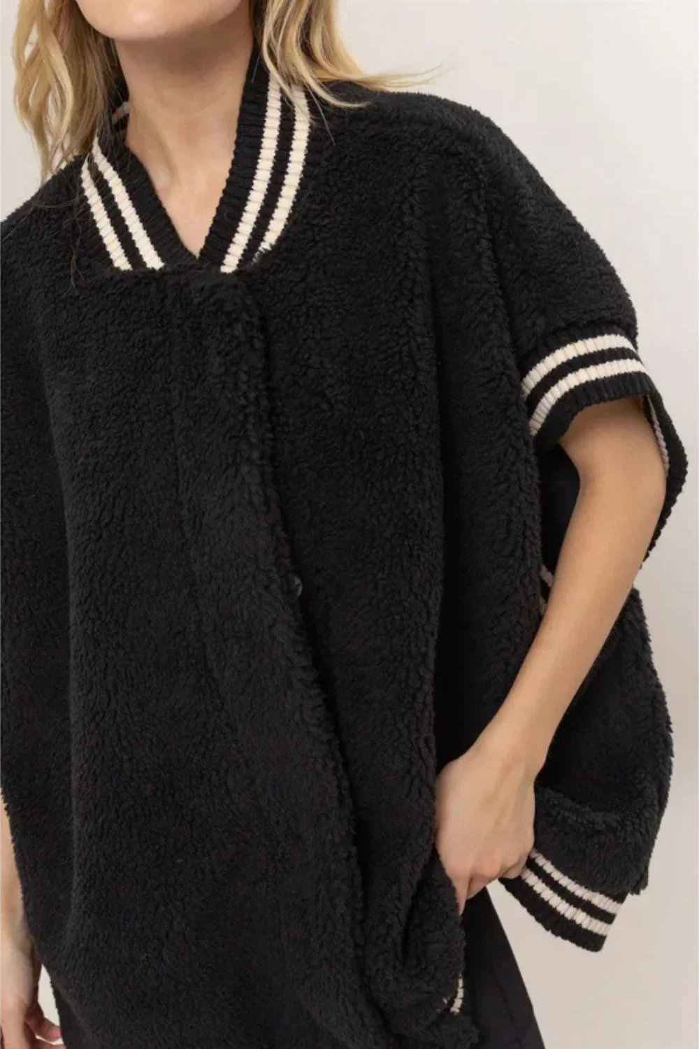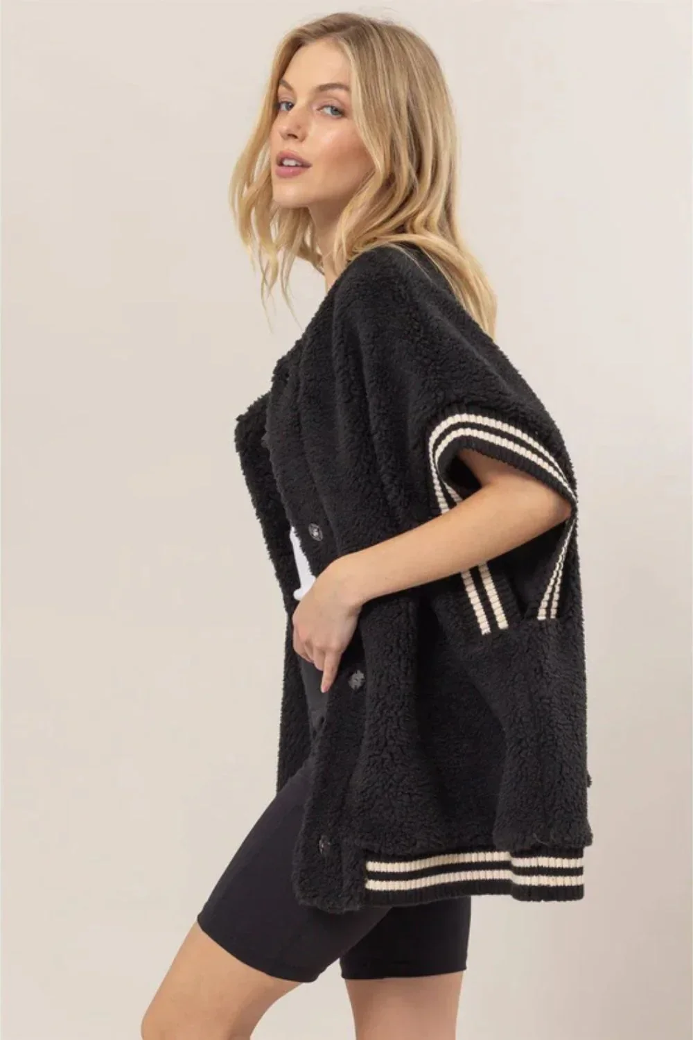 Black Sherpa Oversized Baseball Striped Trim Cozy Vest